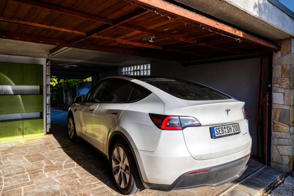 Die Garage verfügt über einen Starkstromanschluss zum Laden von Elektrofahrzeugen.