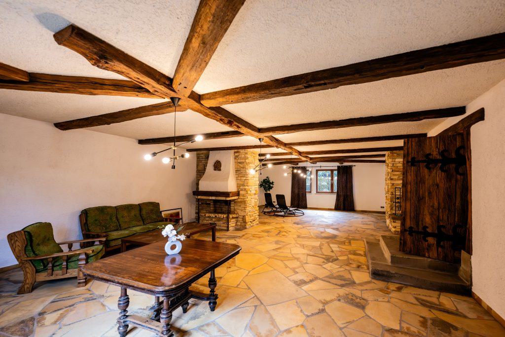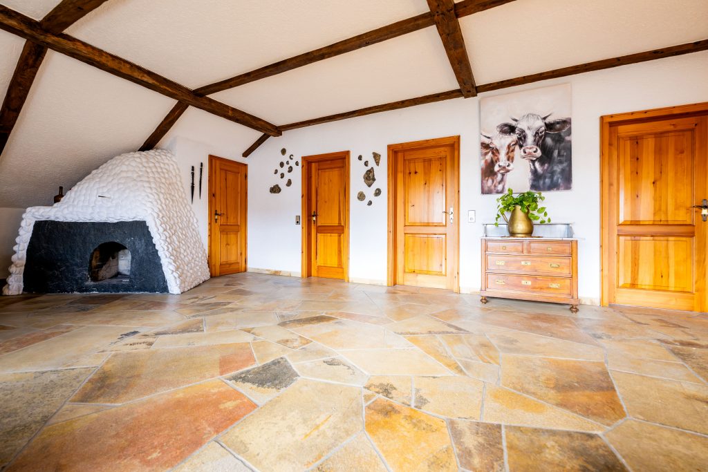 Die Solnhofer Platten auf dem Boden, die Holzbalken an den Decken und die einzigartige Wandverkleidung aus Ammoniten geben dem Haus seine einmalige Atmosphäre und verschaffen ein tolles Raumgefühl – hier wurden keine synthetischen Materialien verwendet!
