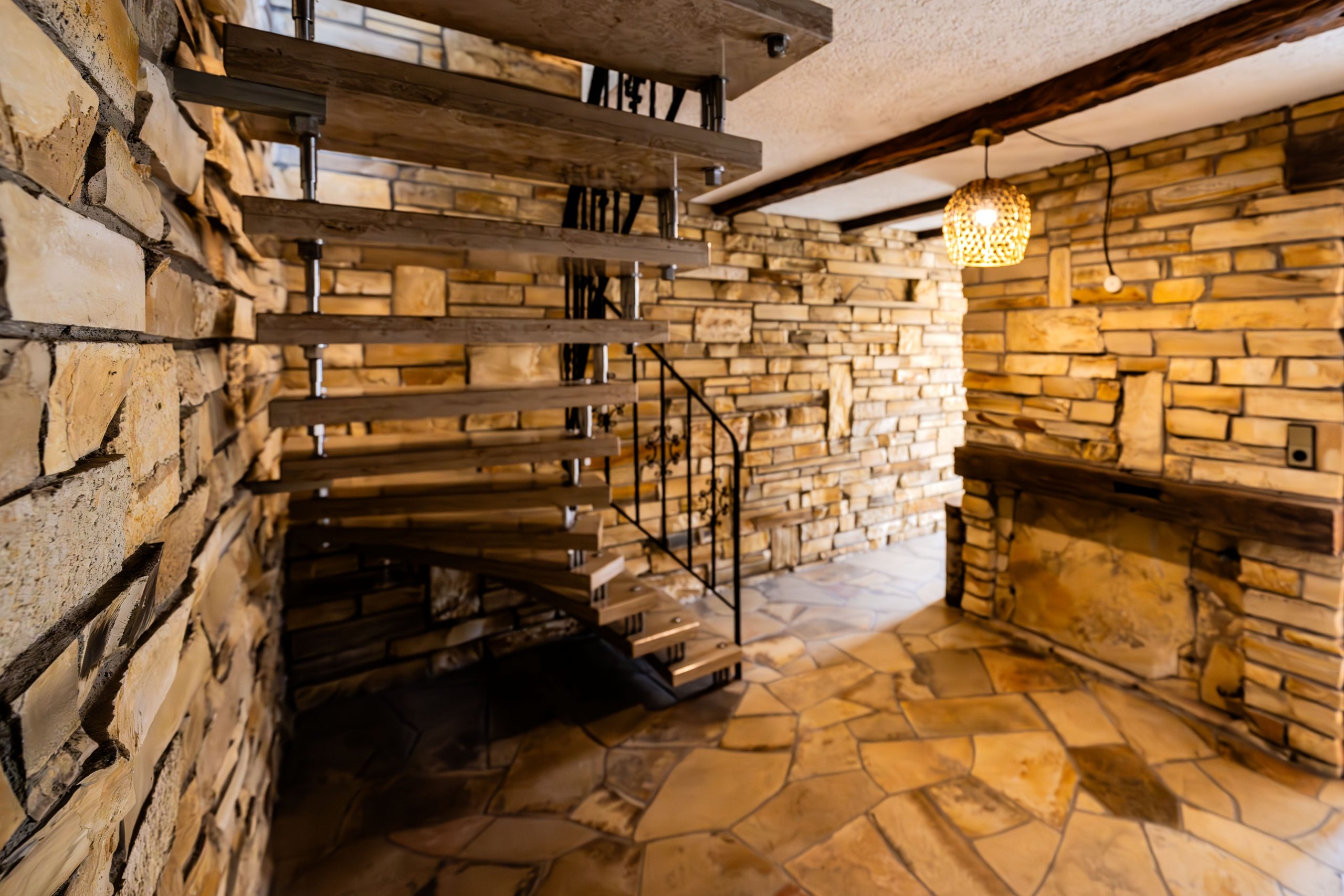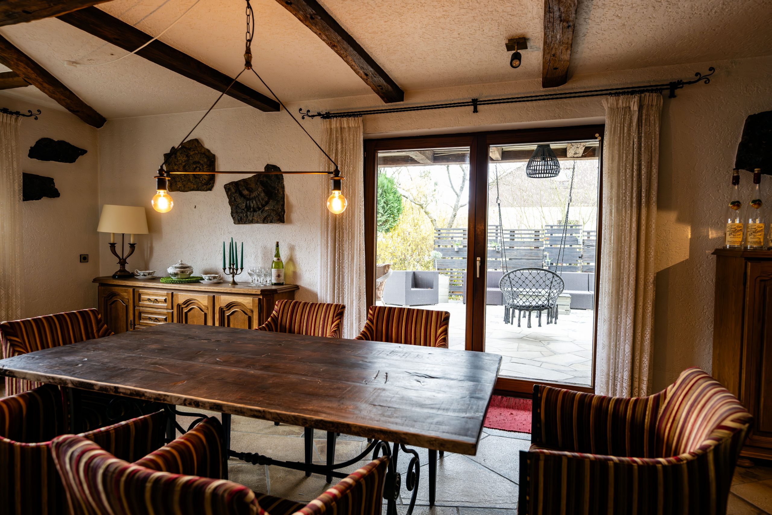 Die Solnhofer Platten auf dem Boden, die Holzbalken an den Decken und die einzigartige Wandverkleidung aus Ammoniten geben dem Haus seine einmalige Atmosphäre und verschaffen ein tolles Raumgefühl – hier wurden keine synthetischen Materialien verwendet!