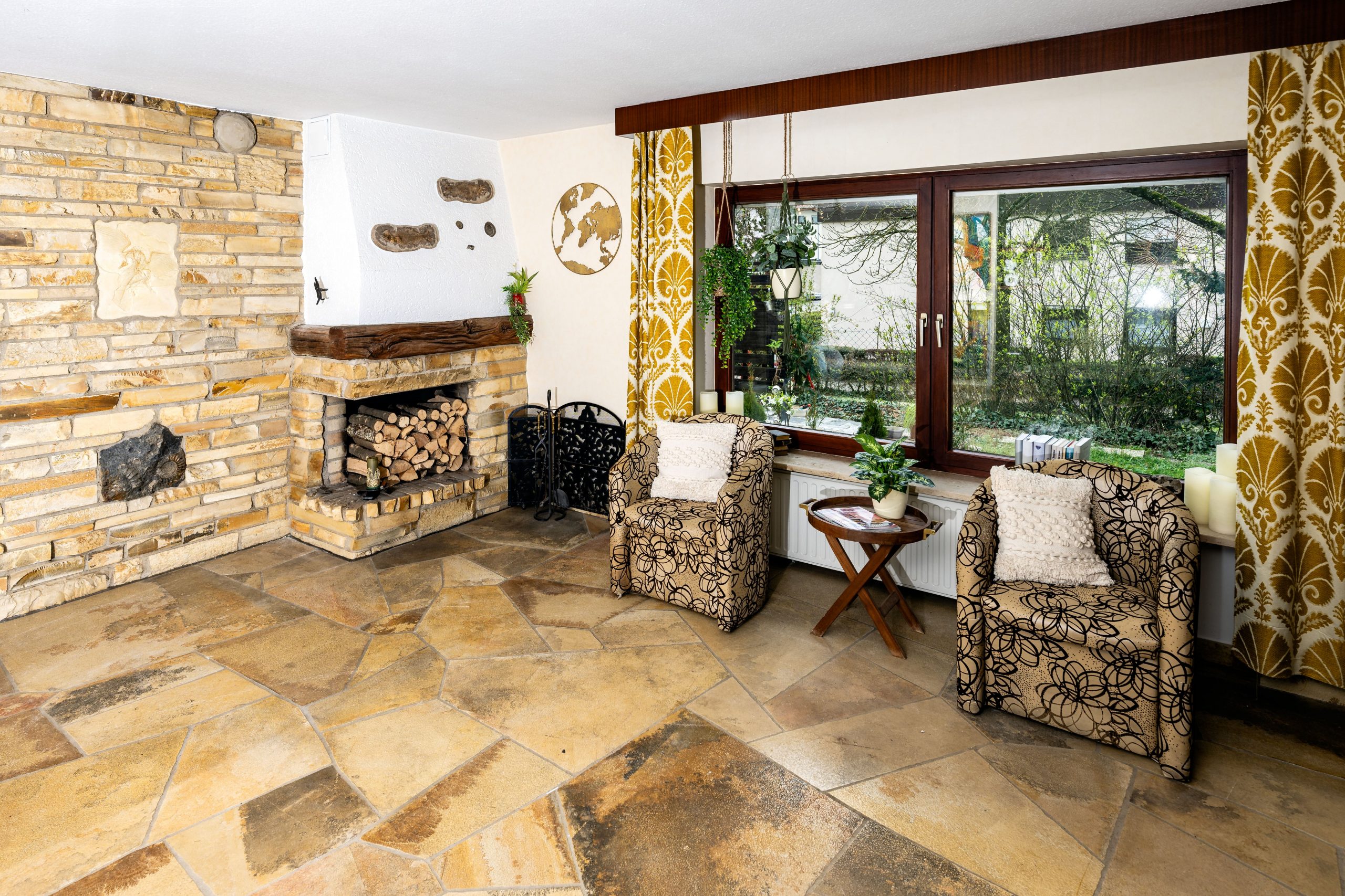 - sehr großes Wohnzimmer mit Fensterfront zum Garten und tollem, offenen Natursteinkamin